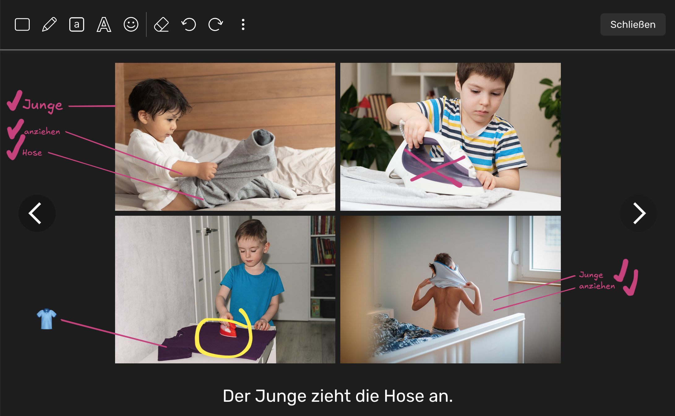 Damit wird es einfacher, während der Nutzung unserer Therapieplattform zusätzliche Notizen, Ideen oder visuelle Hilfen hinzuzufügen. Sofern diese Funktion für eine Übung zu Verfügung steht, sehen Sie nach Start einer Übung oben links einen entsprechenden Button. Sie können damit auf den Folien einer Übung zeichnen, Pfeile und Linien, Formen, Text oder Emojis hinzufügen.