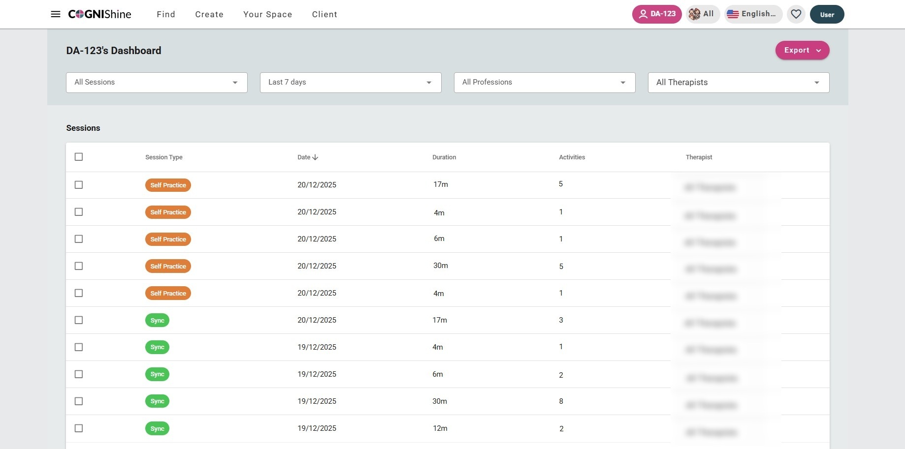 - Session type - Sync sessions (carried out during a therapy session) and Self Practice sessions